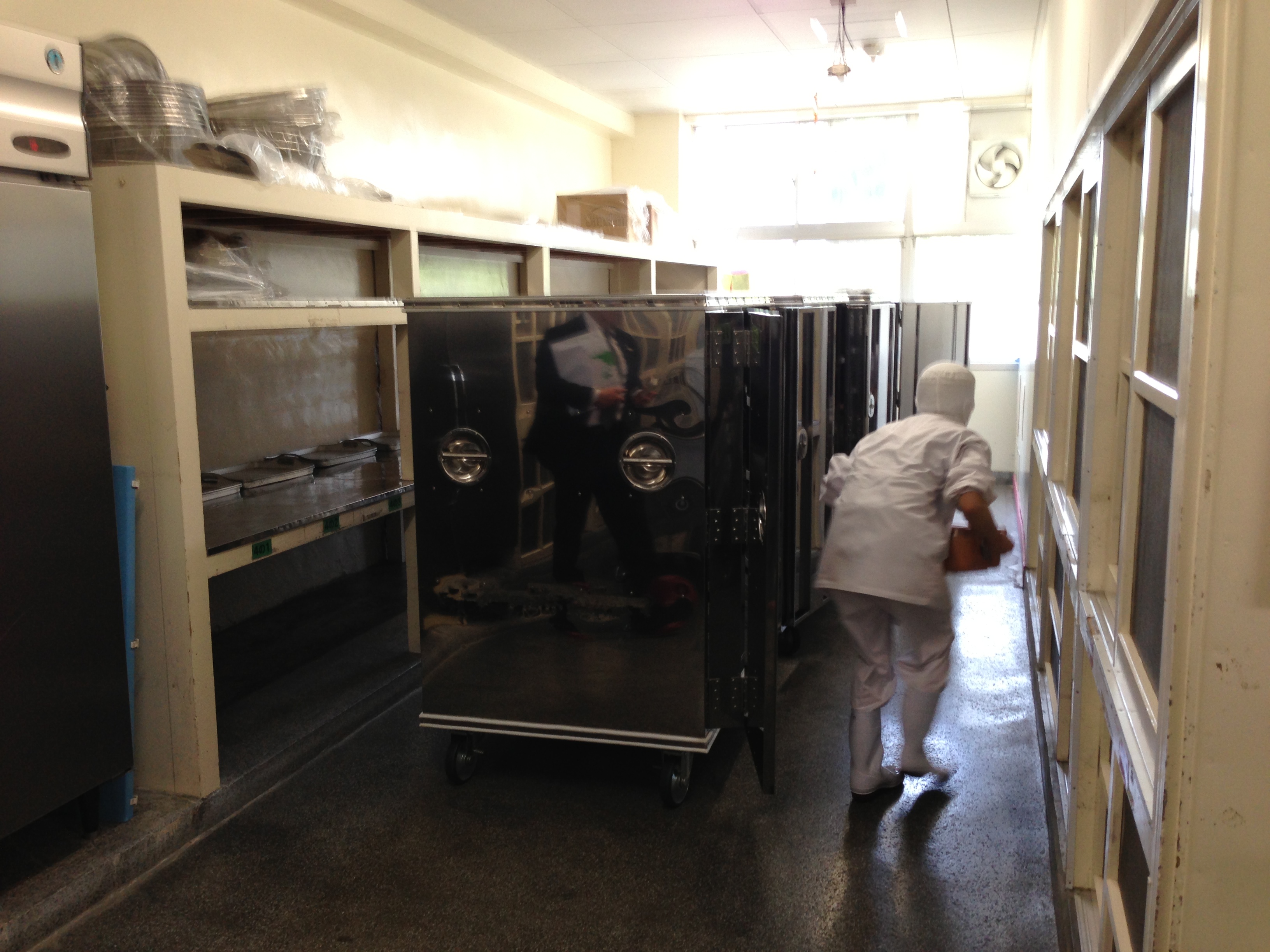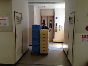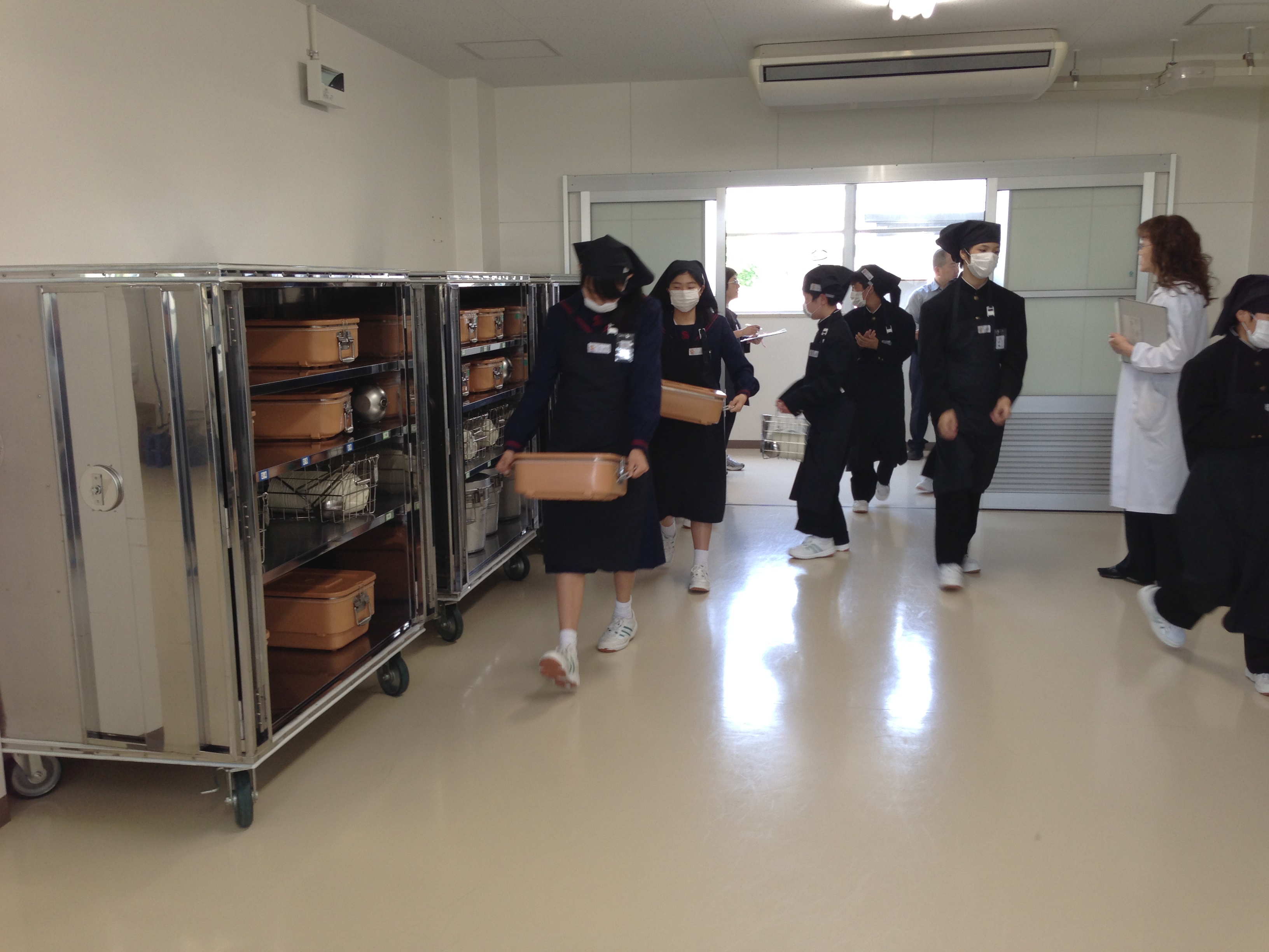 ここ配膳室にて受け渡しを行います。配膳をしていただく人も民間業者から