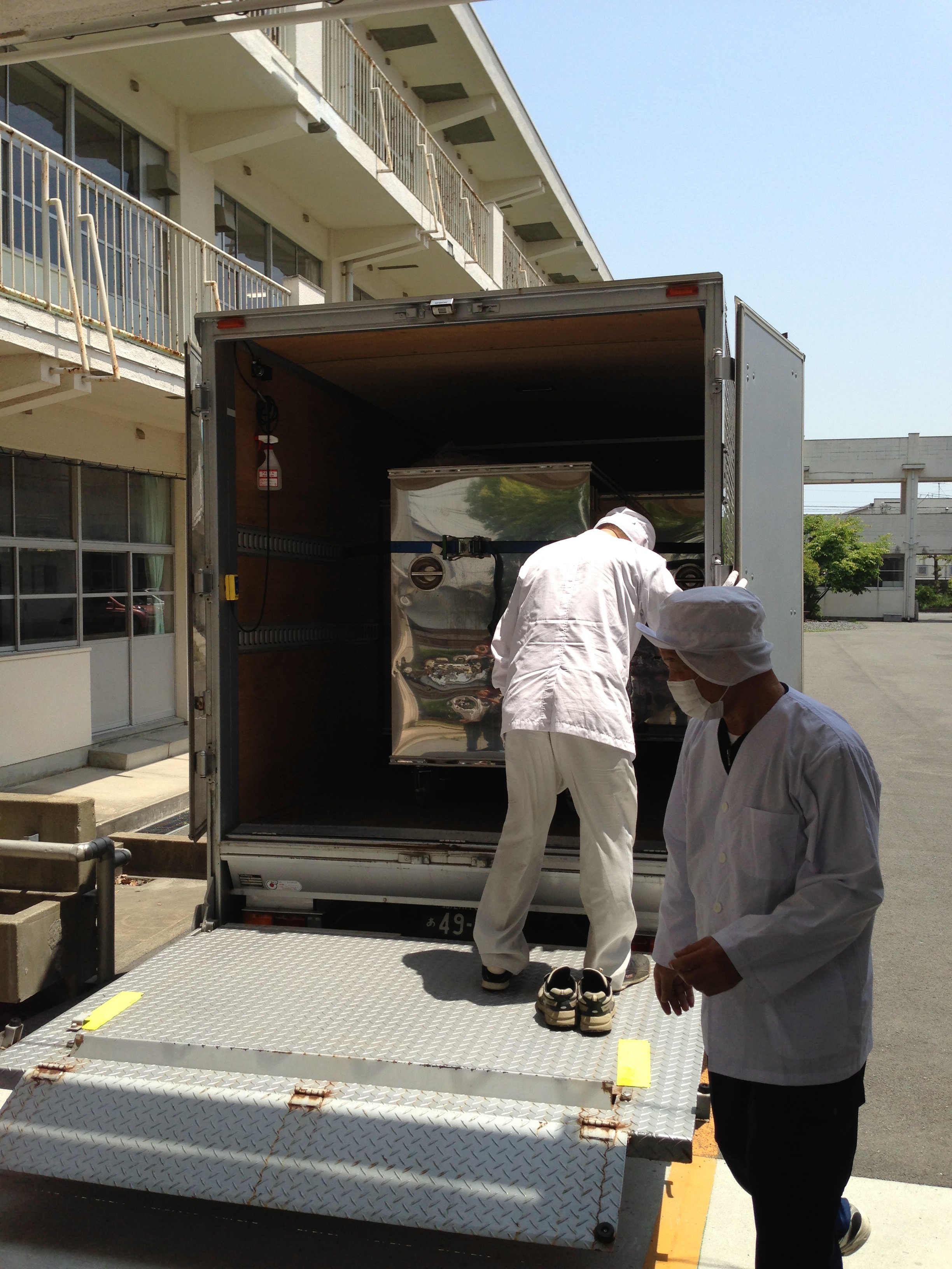 専用のトラックにて配送されます。給食を請け負っている業者が、調理、配送、