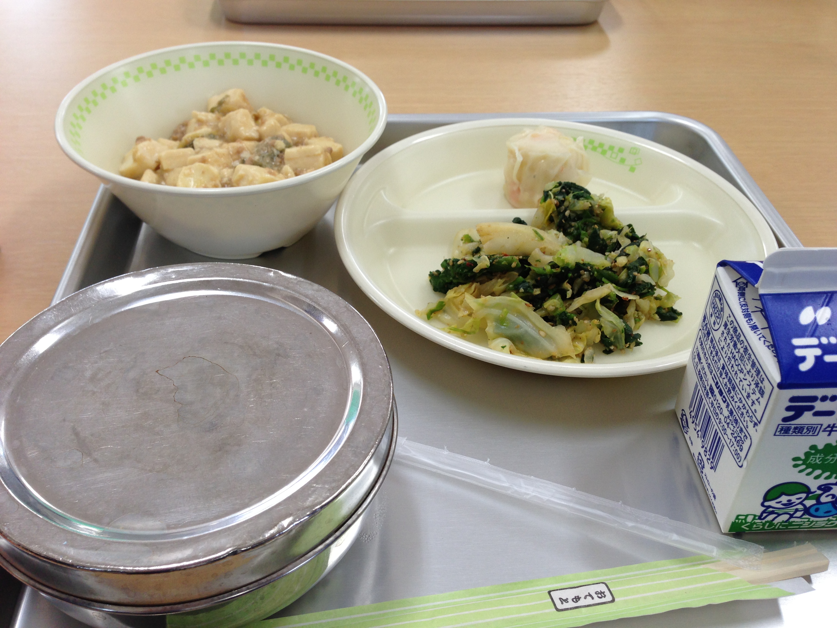 本日の献立はマーボー豆腐、しゅうまい、ナムル、牛乳、ごはんです。