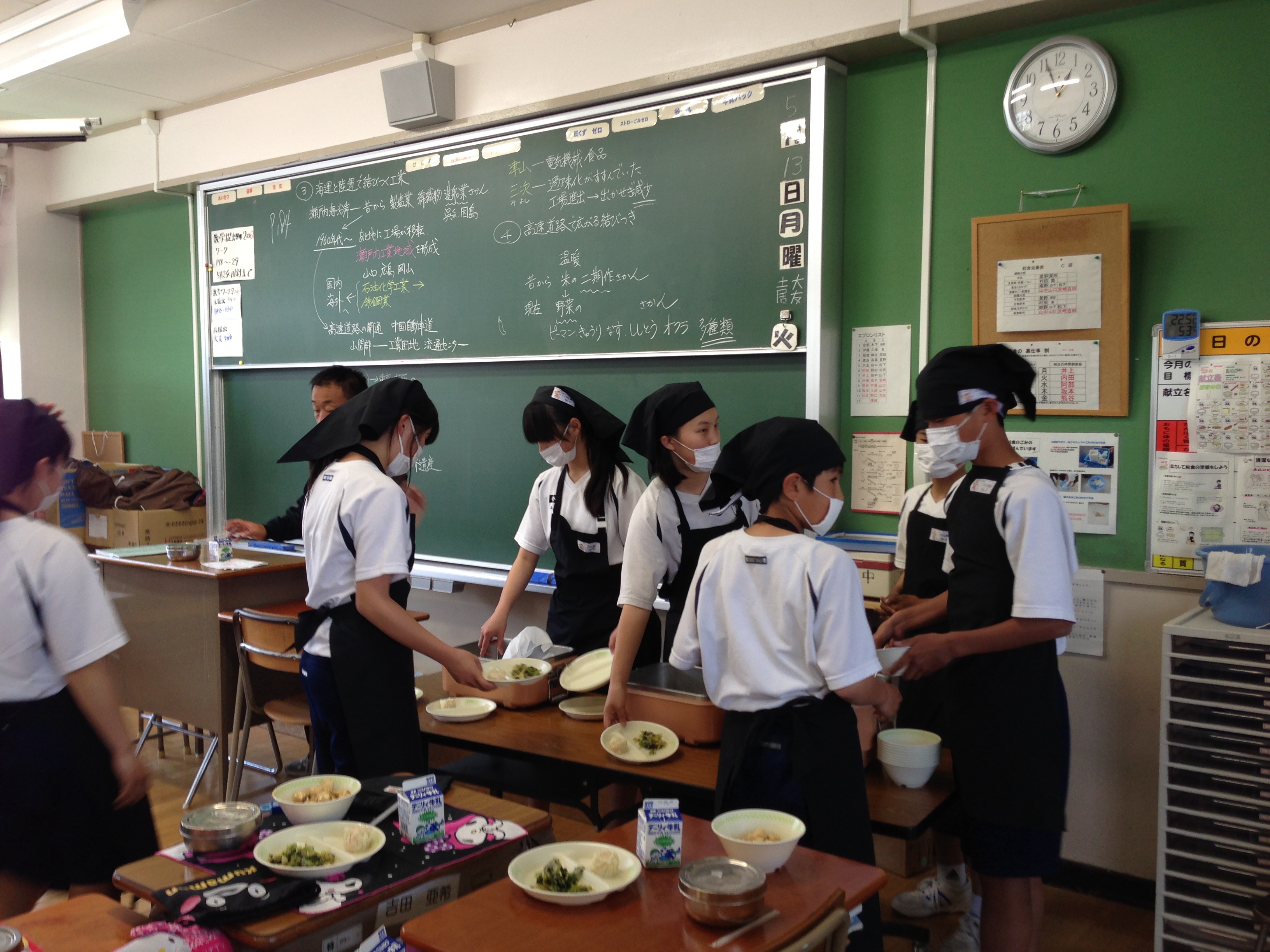 実施しています。小学校で調理した給食を中学校へ配送したものを食べる方式で行っています。